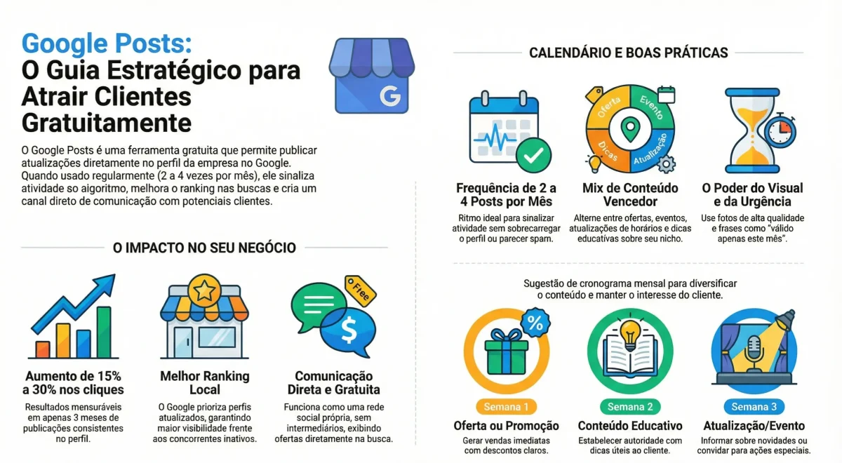 Google Posts é um recurso que a maioria dos empresários ignora completamente, mas que oferece benefício mensurável quando usado corretamente. É uma forma grátis de manter seu perfil ativo, sinalizar ao Google que seu negócio está operacional e oferecer informações frescas aos clientes que consultam seu perfil.