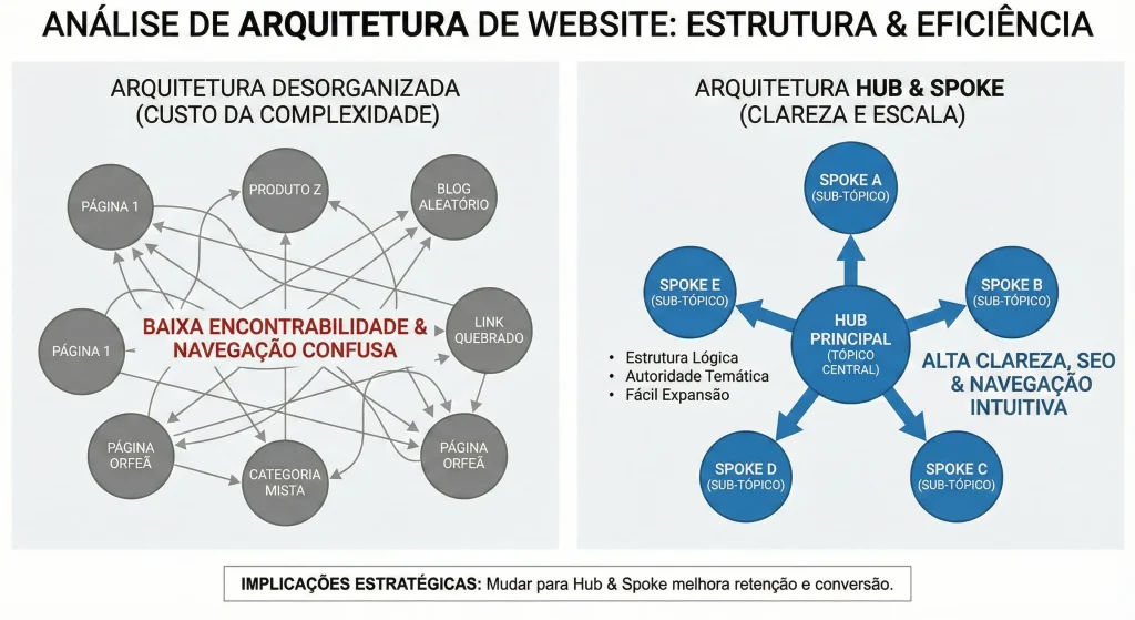O segundo demonstra a estrutura ideal de “Hub and Spoke” (Silos), que concentra a autoridade temática.
